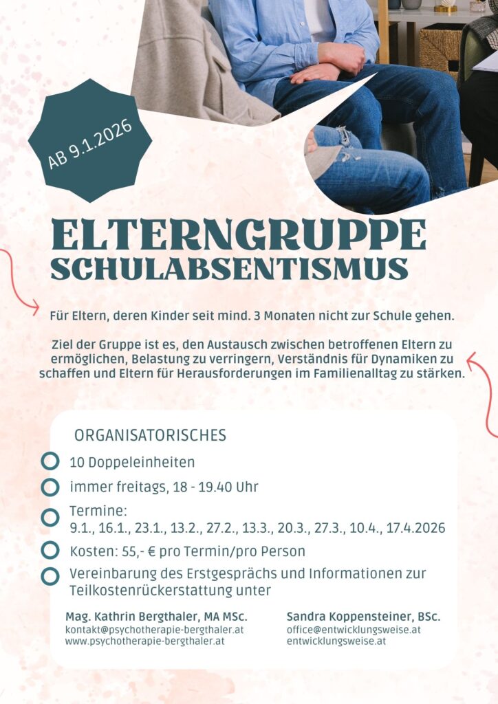 Mit voraussichtlichem Start im Jänner 2026 biete ich gemeinsam mit meiner Kollegin Mag. Kathrin Bergthaler, MA MSc. eine therapeutische Gruppe für Eltern an, deren Kindern es aus psychischen Gründen mindestens drei Monate nicht möglich war, die Schule/Lehre/Ausbildungsstelle zu besuchen.